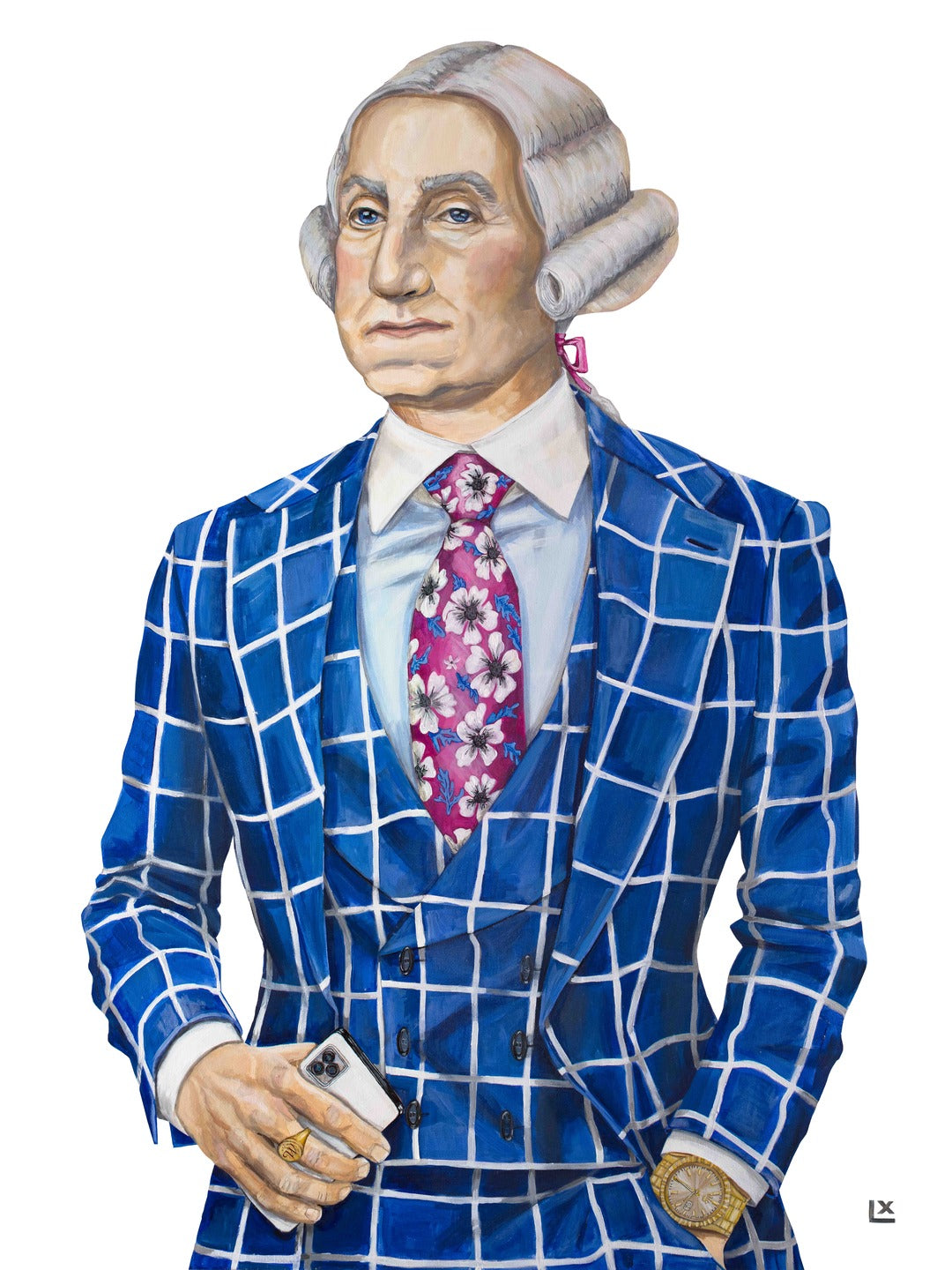 George Washington, like his father, was a farmer. Washington believed agriculture to be the noblest of professions, and crucial to the growth of our nation. He was innovative with his crops, practicing crop rotations to preserve the soil, experimenting with new breeds of crops and farm animals. The checkered pattern of his jacket represents the grid pattern of a farm's fields.