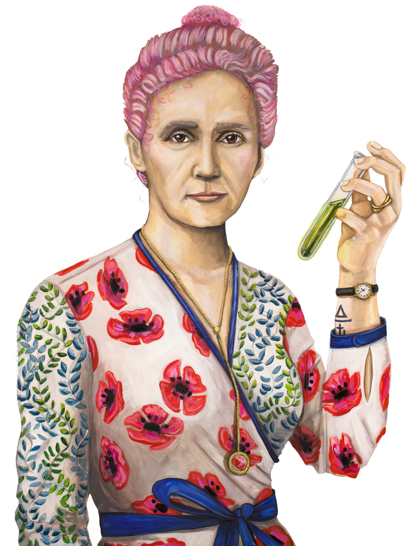 The color pink is often associated with femininity and womanhood. Despite working in a male-dominated field, Curie frequently wore dresses in the lab, confidently maintaining her identity as a woman among mostly male colleagues
