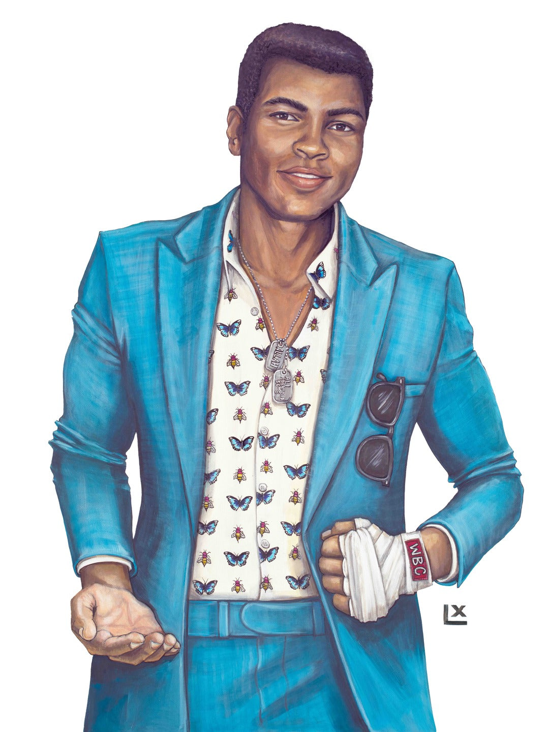 Here, Ali's hand is balled up into a fist, representing the "punches" in the painting's title. His balled fist represents his fierceness in life and in the ring.